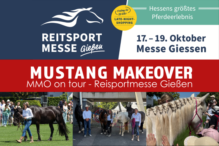 Vom 17. bis 19. Oktober könnt ihr uns auf der Reitsportmesse Gießen treffen. An diesen Tagen habt ihr die wunderbare Gelegenheit, uns und die Mustangs in Gießen zu treffen: entweder an unserem Stand C4 in Halle 6 oder bei unseren Auftritten in den Reitringen.